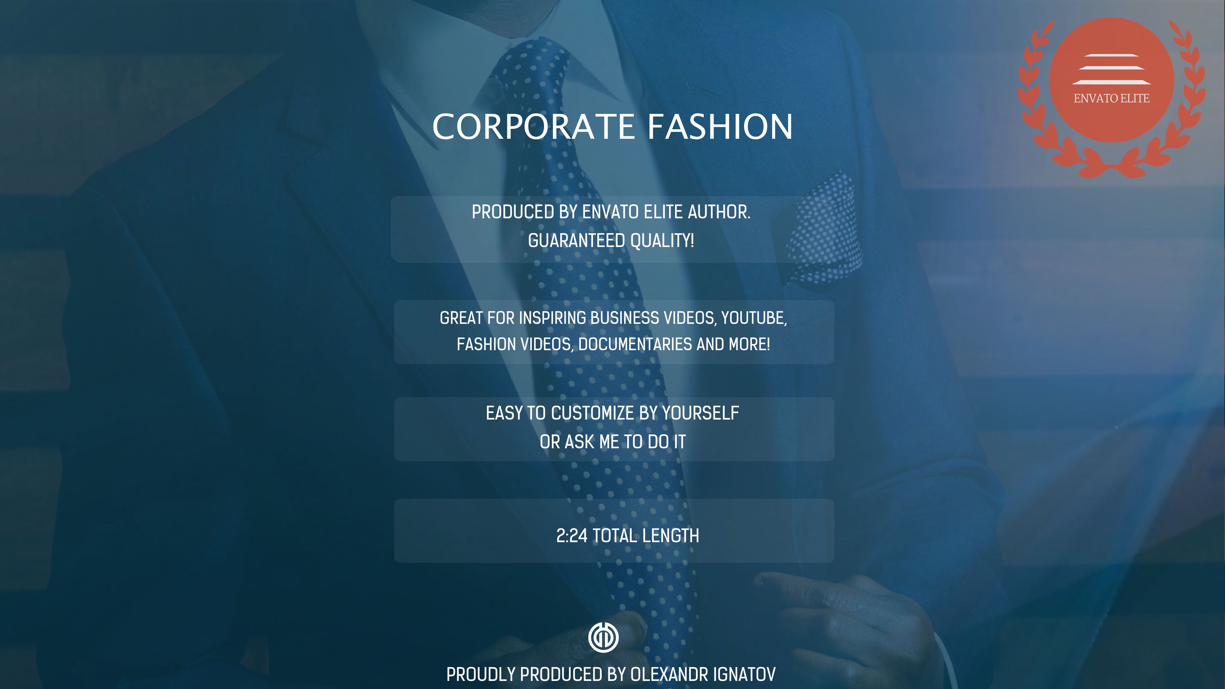 “Corporate Fashion” is a soft, upbeat, funky fashionable corporate styled music track with a beautiful soft presentation corporate sound, corporate motivational vibes and steady confident rhythm and bass groove to deliver inspiring corporate atmosphere that will help you to make your corporate, fashion or other project really stand out and inspire!