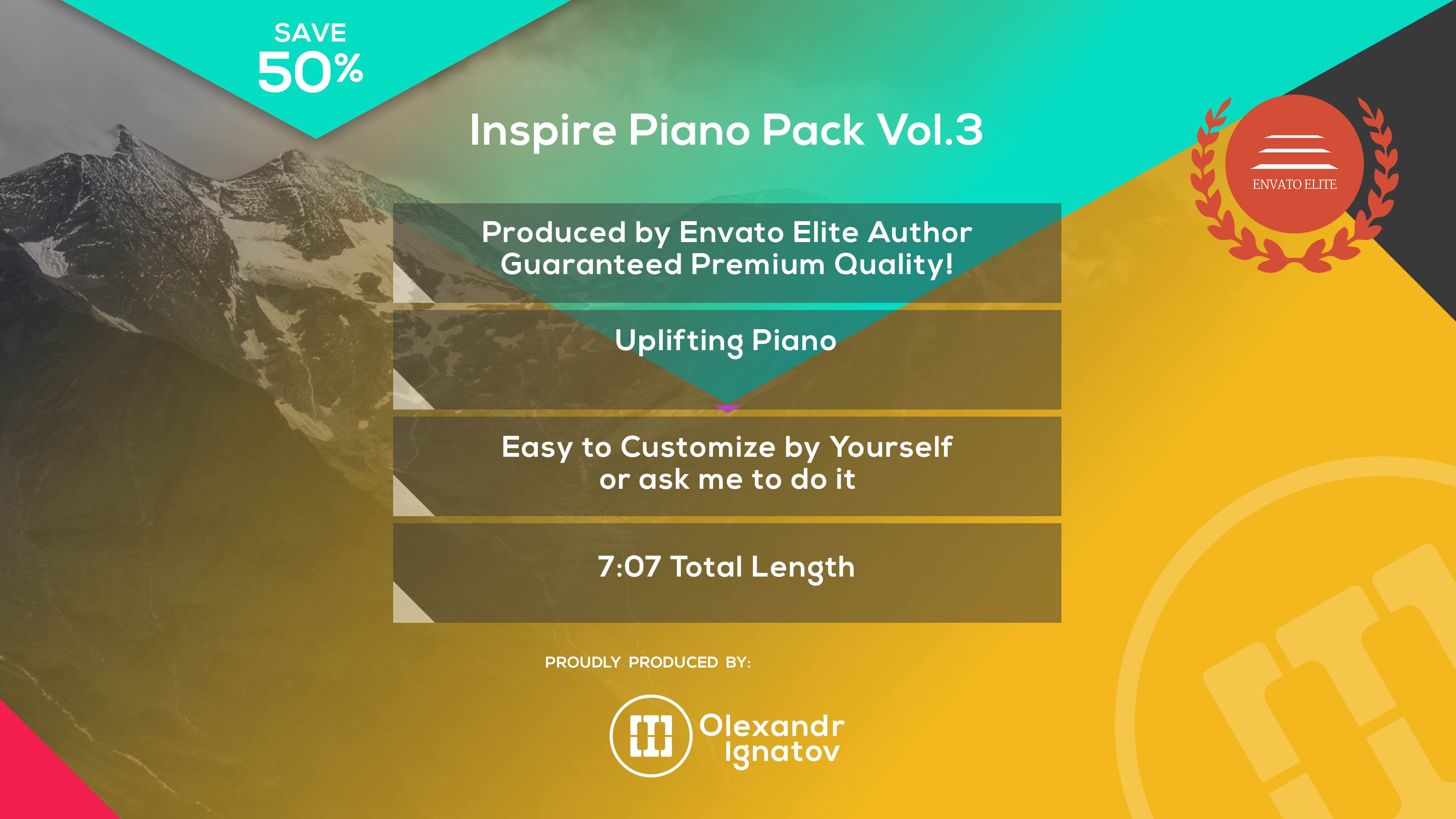 Inspire Piano Pack Vol. 3 – inspirational collection of three different romantic piano pieces that are light, touching, beautiful and inspiring and are designed to fully cover your beautiful inspirational video project production with variety and options as they are easy to edit and cut if needed. Inspiring pianos and some orchestral support- all together will make any project truly come to life!! Perfect for that wedding videos, as well as marketing, documentary and presentations! Try it today!