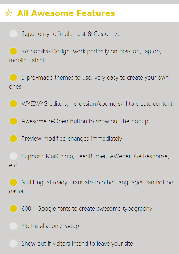 This is a big part of our pride! We have developed our own interface for popup customization. It is very simple and intuitive. It’s been intensively tested by real life users during a beta-test phase. To customize a popup element, just click it and all the available controls will instantly show up.
