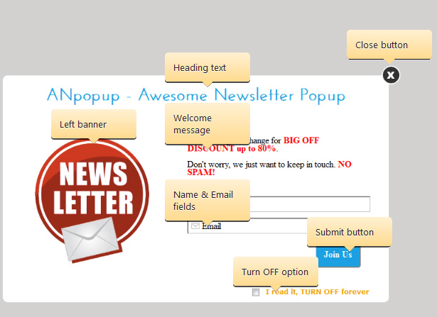 John is about to leave your site and log-in his own to make a couple of changes and install the plugin you recommanded. He is dragging his cursor towards the “close tab” button, and BOOM, a nice designed popup asks his if he want to register to your newsletter.
