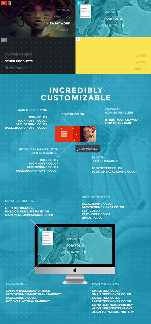 Jumbo is a WordPress menu plugin that you can add to any theme, and it comes with a bit of a unique twist. Next to allowing you to build a bold, memorable and fully responsive full-screen menu, you can also create an optional, secondary drop-down menu.