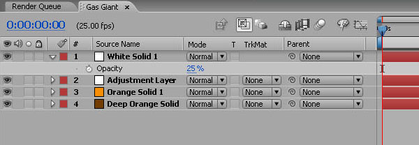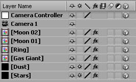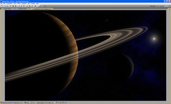 From the Project Window, drag the ‘Gas Giant ‘ composition onto the timeline. Make this layer 3d by ticking the 3D layer checkbox.