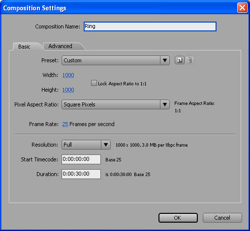 Create a new Composition called ‘Ring’. Make it 1000×1000 pixels and change the ‘Pixel Aspect Ratio’ to ‘Square Pixels’.