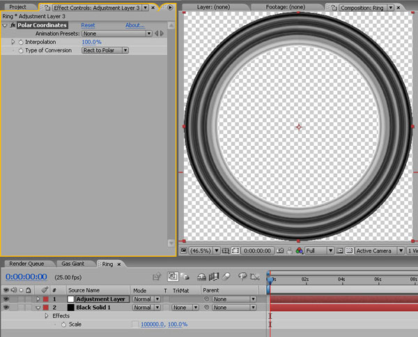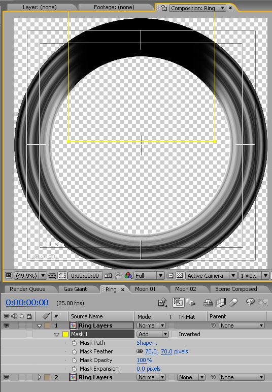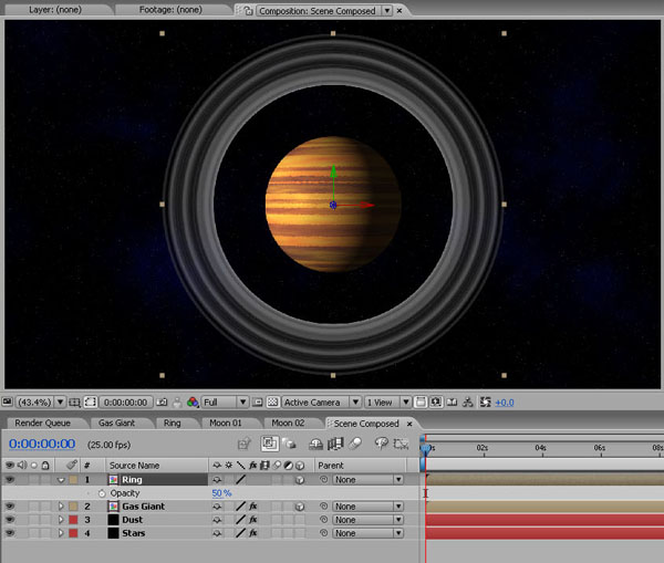 Drag in the ‘Ring’ composition and make this layer 3d also. Set its opacity to 50%.