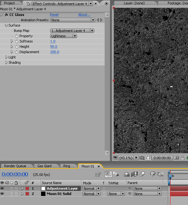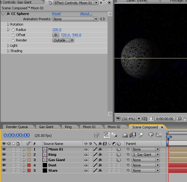 So now, any properties for lighting that you change in the Gas Giant CC Sphere options will change on the moons too. So go into the Effect Controls for the Gas Giant and in the ‘Shading ‘options, drop the ‘Ambient’ and the ‘Specular’ to 0, to really darken the ‘dark side’ of the planet and moons.