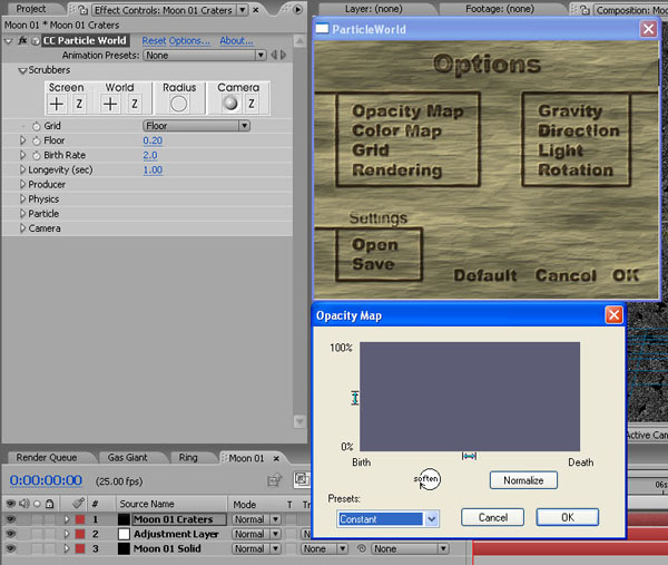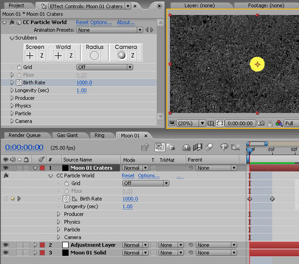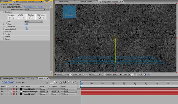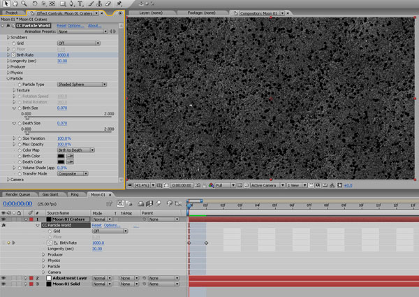 Next we’ll add some craters. Create a new Black Solid (Layer / New / Solid), call it ‘Moon 01 Craters’ and add Effect / Simulation / CC Particle World.