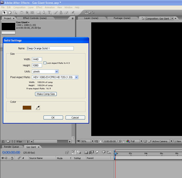 Create a new HDV 1080 25 composition called ‘Moon 01′. Make it 30 seconds long.