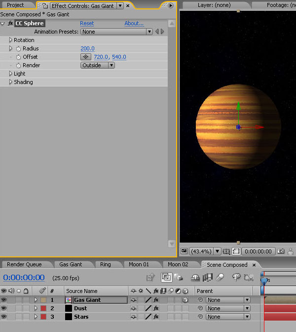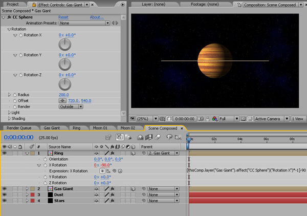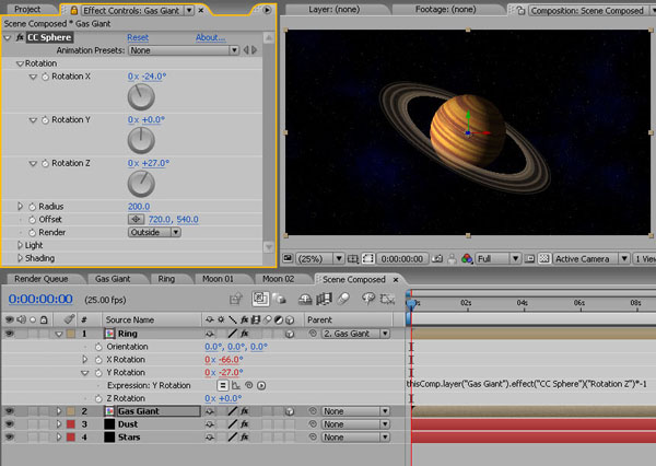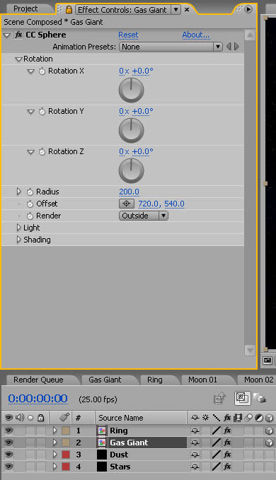 In the Gas Giant’s CC Sphere Effect Controls, play around with the X and Z rotation values and see how the Ring stays locked to the planet’s rotation.
