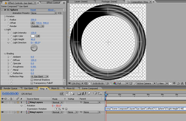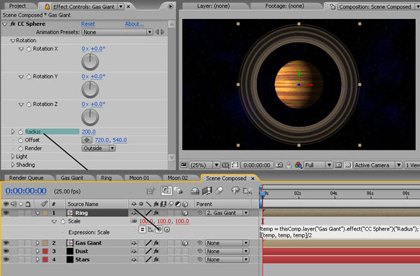 Take the pickwhip from the Ring’s Scale properties and link it with the Gas Giant’s CC Sphere Radius. This makes the rings rather too big, so add ‘/2′ to the end of the expression to divide the size by 2.