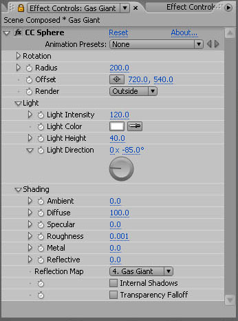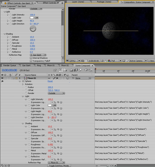 On the ‘Moon 01′ layer, drop down the CC Sphere Effect options. Now pickwhip the following properties to those of the Gas Giant’s: Light Intensity; Light Color; Light Height; Light Direction; and in the Shading options: Ambient; Diffuse; Specular; Roughness; Metal and Reflective.