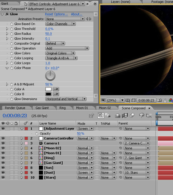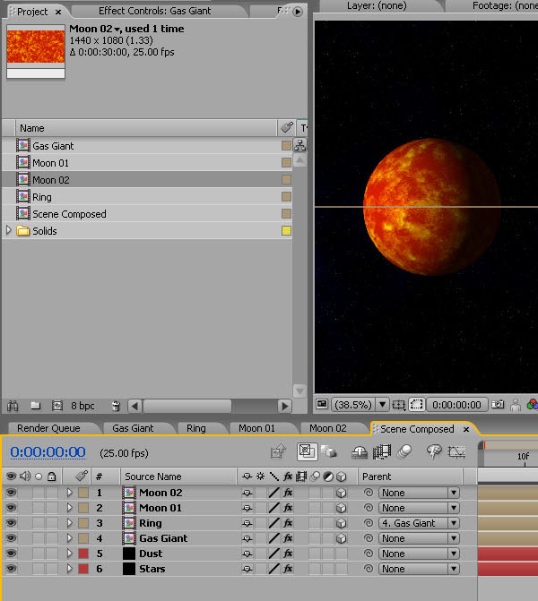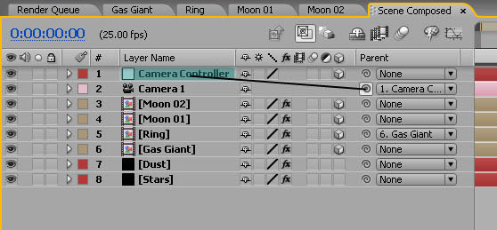 Then take the pick whip and parent the Rings layer to the Gas Giant Texture Map layer to lock them together.