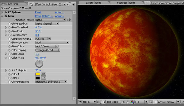 Now add an Effect / Stylize / Glow to Moon 02 to create a sulphur-rich atmosphere. Set Glow Based On to Alpha Channel; the Glow Threshold to 0, Glow Radius to 35, Glow Intensity to 0.4, Composite Original to ‘On Top’, and choose and sulphur-yellow for Color A.