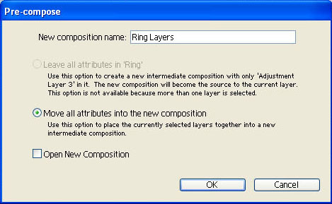 Pre-Compose the Ring layers by going into the Ring composition holding down CTRL and clicking on both layers. With both selected choose Layer / Pre-Compose, call the new composition ‘Ring Layers’, tick ‘Move all attributes into the new composition’ and click OK.