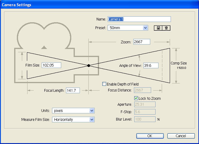 In the ‘Scene Composed’ composition, create a 50mm camera (Layer / New / Camera)