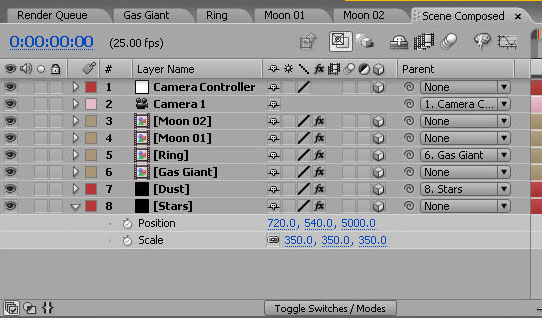Parent the Dust layer to the Stars, make both 3d, and set the Z position on the Stars layer to 5000. Then scale it up to where it’s just bigger than the composition window, about 350%.