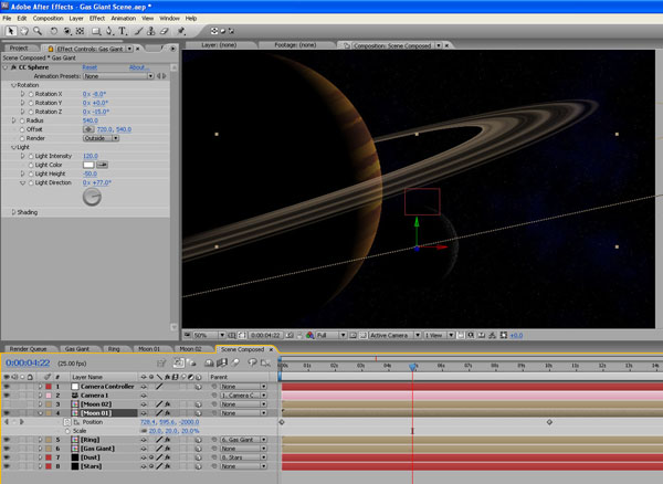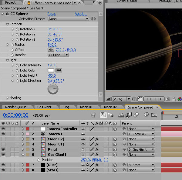 In the Gas Giant CC Sphere controls, increase the radius to 540 (this is as big as the radius can get without the planet getting too big for the composition), set the Rotation X as -8, Rotation Z as -15, Light height as -50 and Light Direction as 77 (or just whatever you like – this is just how I have set it up for the final render).