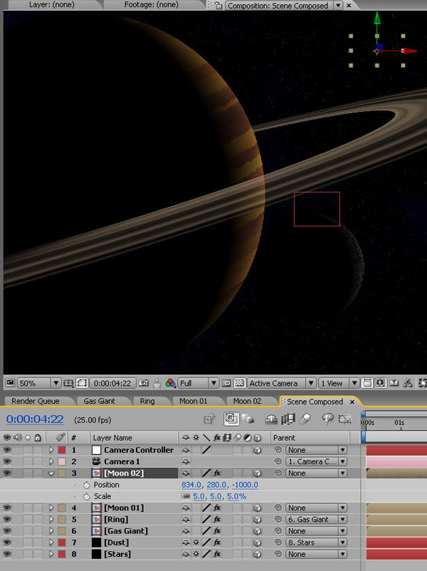 Position Moon 02 at -1000 in Z-space and reduce down to 5%. Place it above the rings, somewhere in front of the Gas Giant.