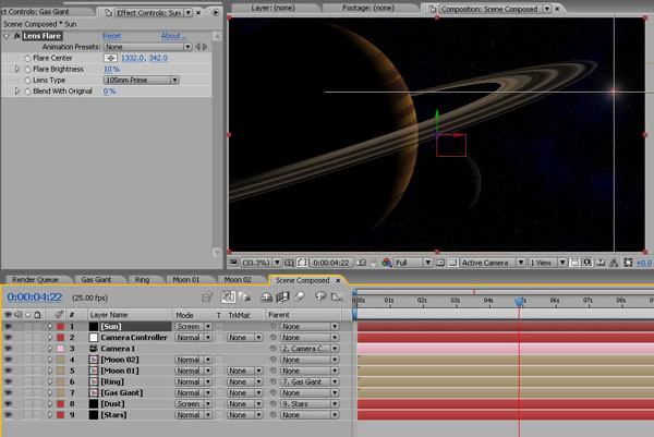 Lastly, create a new Black Solid and call it ‘Sun’. Make it 3d. Then add Effect / Generate / Lens Flare, and select a 105mm Prime Lens Type. Reduce the brightness to 10% and position the light in the top right of the frame to match the light direction on the Planet and Moons. Now set the blending mode to screen.