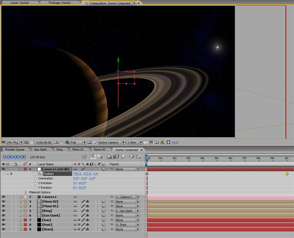 Set a position keyframe on the Camera Controller layer at 10 secs in. Go back to the start and set another keyframe, this time altering the Y position to move the camera up so that the Gas Giant sits towards the bottom of the frame. Go back to the second keyframe, make it an easy ease in keyframe (Right Click / Keyframe Assistant / Easy Ease In).