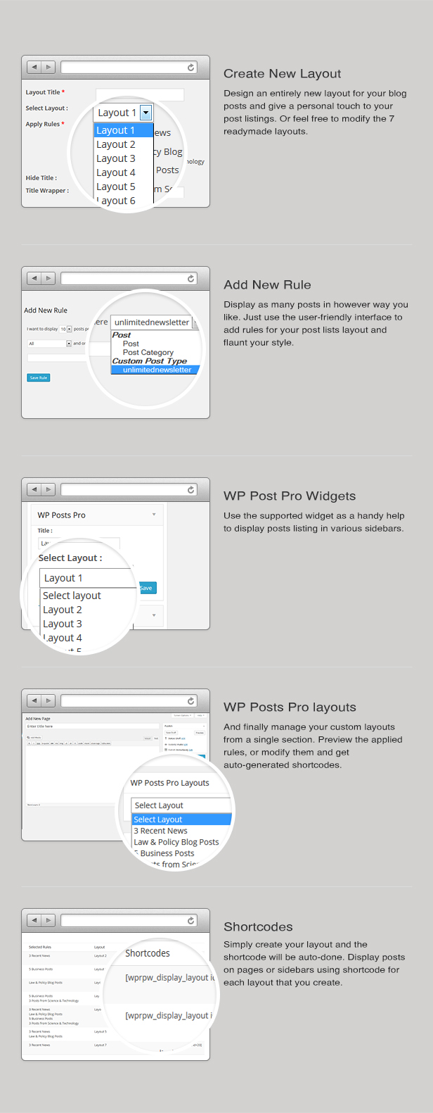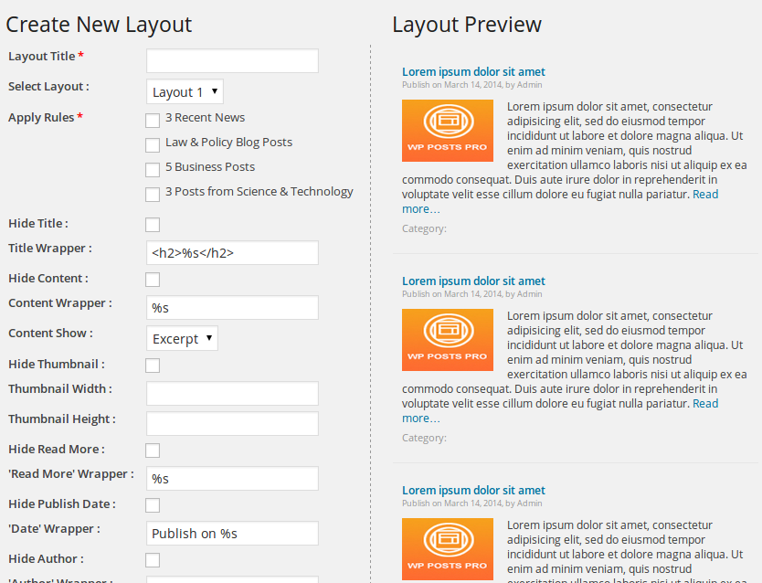 WP Posts Pro is a wordpress plugin to display blog posts listing without any programming. Just create Rules & Layouts and display them on widgets or pages easily. We’re providing 7 Layouts which are mostly used and each layout has various customization options.
