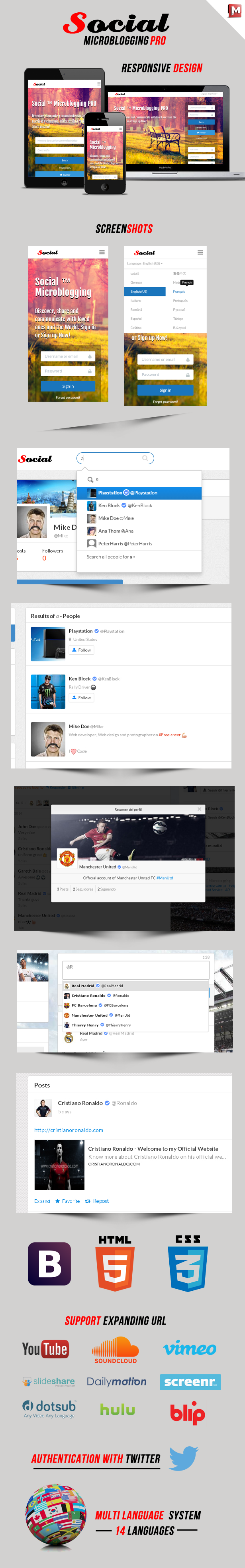 Social Microblogging PRO Twitter is a script style, designed to share news, events, or simply what you want, through publications of 140 characters, and may refer to other users, create Hashtag and share with other site users. a part of it can upload images, videos from Youtube, DailyMotion, Screenr, DotSub, Hulu (Permitted users only united states ) or Vimeo. Follow other users, send direct messages. and other features that will be described below.