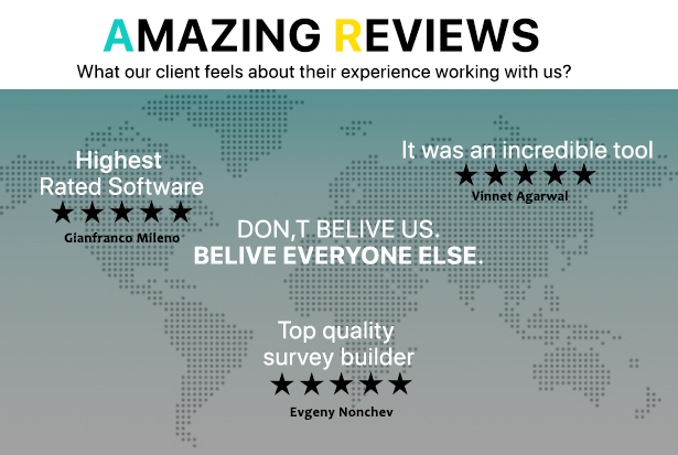 Survey Builder Tool let’s you generate any kind of complicated survey’s in 15 min with Drag & Drop backend. Comes with 100% white labeled solution and great interface .