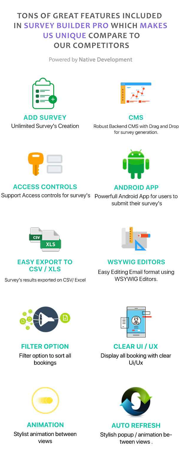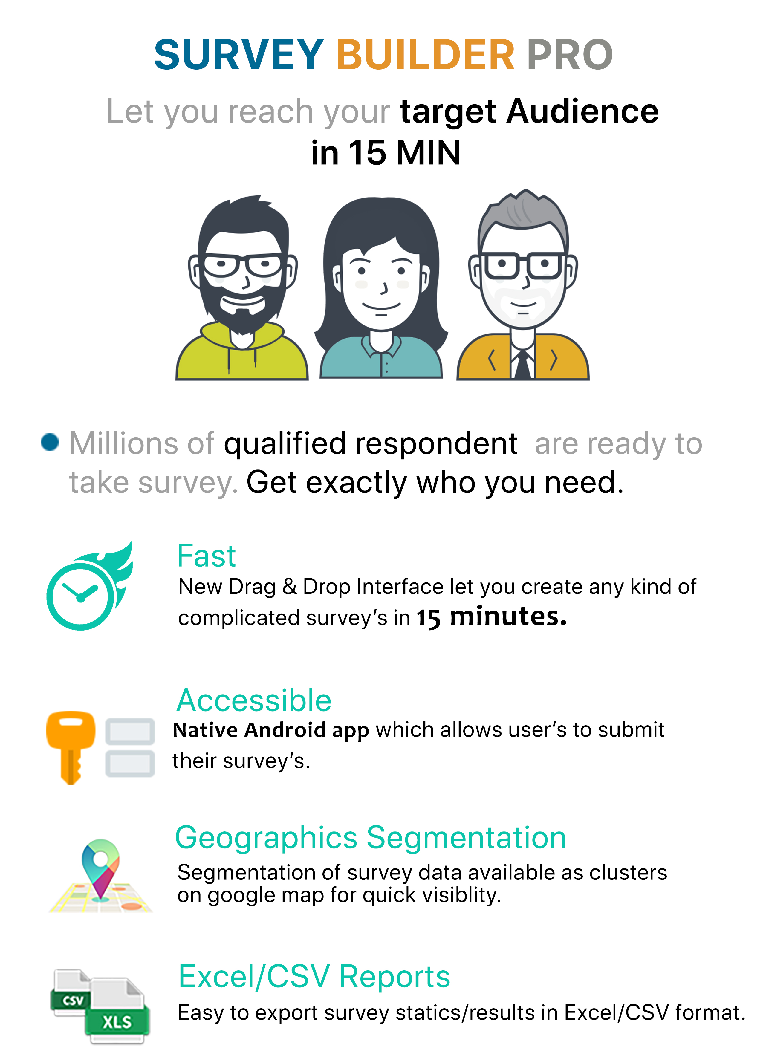 Survey Builder Tool let’s you generate any kind of complicated survey’s in 15 min with Drag & Drop backend. Comes with 100% white labeled solution and great interface .
