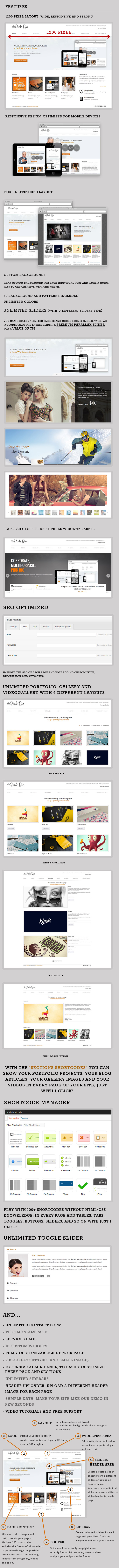 types, header uploader to upload a different header image for each page, unlimited portfolio, unlimited gallery and videogallery, shortcode manager, SEO panel to improve