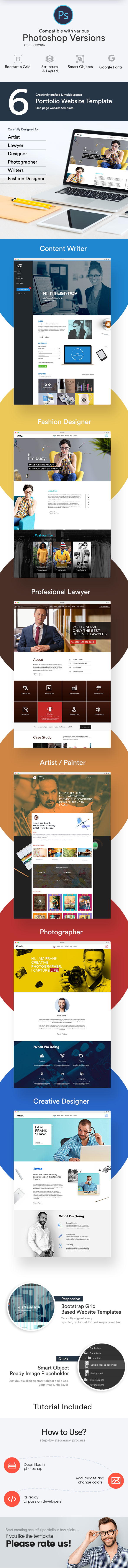 Hello PSD Template is a creative and easy to use PSD template with clean and modern design. It is perfect choice for your any kind of portfolio design like an Artist, Lawyer,, Photographer, Web designer, Writer, Fashion designer etc . It has 6 portfolio pages designed on grid and can be be easily converted into responsive html using Twitter Bootstrap or any other responsive framework. It is perfect for WordPress, Drupal themes or other cms and frameworks and can be used for personal portfolio, corporate, company portfolio or for promotion landing pages. PSD files are well organized and named accordingly so its very easy to customize and update.
