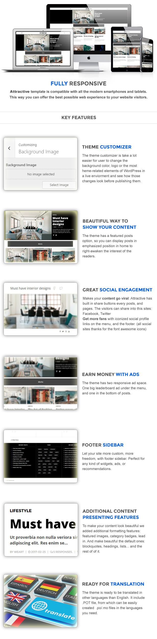 Attractive WordPress Theme is designed specially for those who not want compromises, like the clean, modern, minimalist looking, and want to make a great news or magazine website. It has dozens of impressing features that will make your blog or magazine exceed among others. Let your visitors enjoy the contemporary design of your new website powered by Attractive.