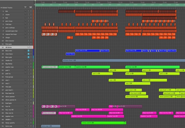 Mine goes some thing like… Red for drums, blue for bass, yellow for synths, green for FX, pink for vocals etc etc. The important thing is that you make up a palette that works for you and then stick to it. Trust me, learning this and taking the time to apply the colouring will make your sessions easier. You will be able to glance at busy projects and know what’s where immediately.
