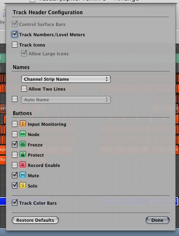 Make sure you are using all the colouring features your DAW has to offer. For instance there are some great little things you can do in Logic, like using the ‘Track Color Bars’. These can be accessed in the ‘Configure track header’ section of the view mini menu in your arrange window. When activated you’ll get small coloured bars in each track and this gives you yet another way to very quickly identify your material.