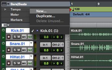 After recording your first take, you will need to create a new playlist for the next take. Make sure the group that you are recording is active, for example the ‘Drums’ group, by selecting it in the groups window or using the shortcut key that you had assigned to the group. If you are recording all the tracks, you can just use the default ‘ALL’ tracks group. Click on the drop down arrow to the right of the track name and select “New… ” to create a new playlist. This will create an empty playlist with ‘.02’ appended at the end and you’re all ready for your next take. All your individual track settings such as track inputs apply to all the playlists that are nested in the same track so you can start recording immediately. Keep repeating this process for any further takes that you may need to record.