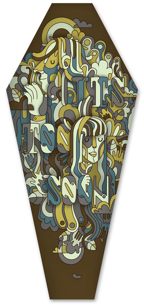 In terms of what I try to do with my work, I think "It’s Too Soon" is my most successful piece. At first, it seems like this really cheery piece showing a young couple surrounded by a whimsical environment. That could be the end of the story. But, you realize it’s in a coffin frame and the saying It’s Too Soon refers to one of them having passed away. It’s really bittersweet.