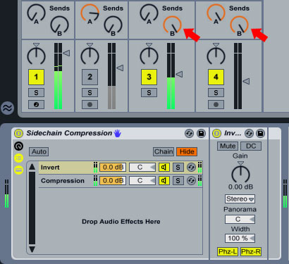 Now increase the corresponding Send value for each track that you want compressed(currently the Base and the White Noise) by turning the knob to the right. The more you increase each track’s contribution to the corresponding return track’s input the more compressed the signal will be as the Utility plug in in the Rack cancels out the signal coming from each track through its Send knob leaving only the compressed signal to pass through. This way we could have multiple tracks being compressed by the same input signal in various degrees.