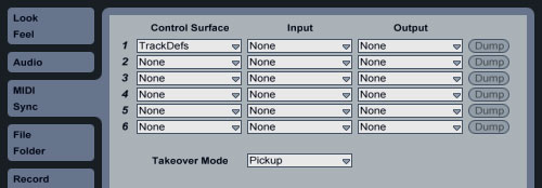 NOTE: It is recommended that you do not use multiple instances of TrackDefs. It should only be selected in one of the six Control Surface slots.