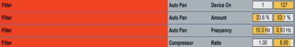 After the ping-pong effect drop an Auto Pan effect. It will gives nice progressively widen stereo effect the whole effect rack. Map the “device on/off, the amount and the frequency” to Macro 1 too. As you can see the amount will increase as you turn the filter knob on the macro parameter but the frequency has an inverted range so the speed of the pan effect will decrease.