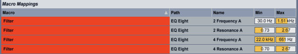 Right Click on the “2 frequency A” and select “Map to Macro 1″, then do the same for “2 resonance A, 4 resonance, A 4 frequency A”, map all these parameters to Macro 1 and rename it to “Filter”. I also gave it a nice red colour.