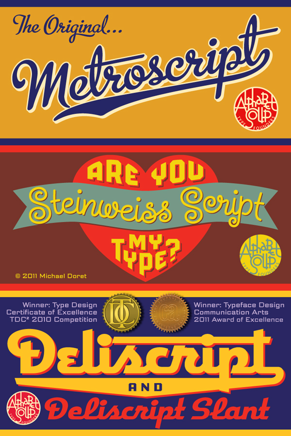 As far as my favorite fonts are concerned, that’s a difficult question. My fonts are all quite different from each other, but I’d have to say that if I had to pick favorites that they’d all probably be my scripts: Steinweiss Script, Metroscript, and Deliscript. They are three fonts in which I feel I have tried to push the boundaries of what’s possible to achieve with a font. They all have extensive OpenType features that allow them to do things that most other fonts cannot do. These features help to remove them from the realm of standard typesetting and to achieve a little bit of the look and feel of hand lettering.