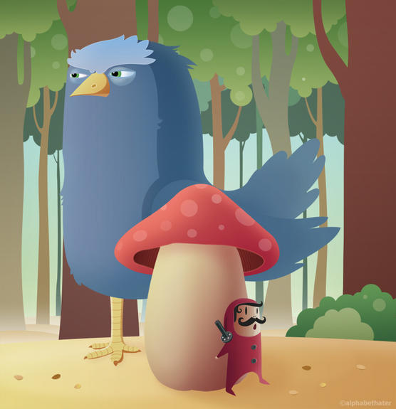 Taking Big Bird to the next level with a childhood game of “Hide & Seek”. Great character design and the use of primary colors have created this charmingly devious scene.