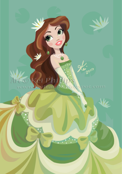 Kinkei‘s work reminds me of Disney’s playful and cartoon style and this piece is one of many which uses it to create an elegant and colorful princess illustrations. What’s appealing and doll like about her illustrations are the big eyes and the feminine dresses, which are common elements throughout her pieces.