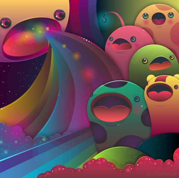 Although darker in saturation than the piece before, Interstellar Friends is still just as bold and varied in color. This is a prime example of a charming character design not requiring the bright primary color palette to enforce a children’s theme. You have to admire the use of gradients in this piece, it’s a unique piece!