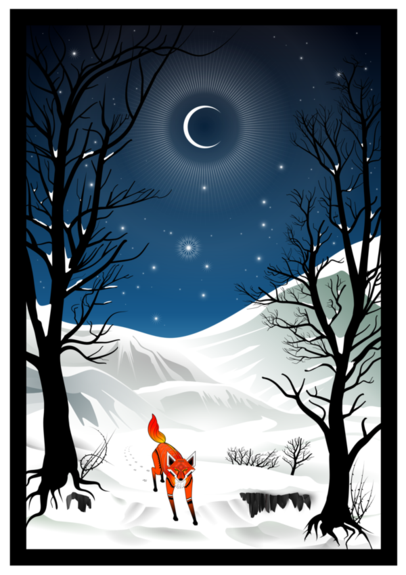 This piece draws influence from the folk tales of “Watership Down”. This illustration is full of little delicate details, such as a the shine from the moon and stars, the tribal markings on the fox and the intricate details in the trees. Again, this is a great illustration using gradients – this time to create atmospheric snow details in the hills. Beautifully done!