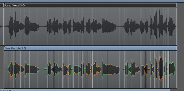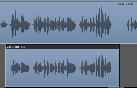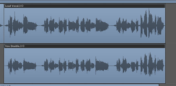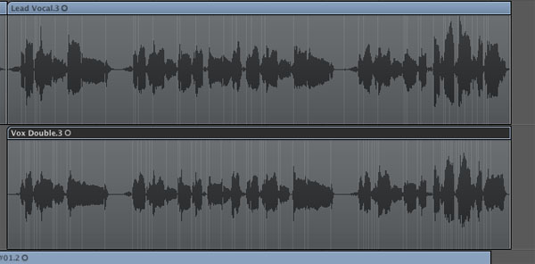 Locate the two phrases you want to be matched. In this case, a lead vocal and a vocal double, to beef up the chorus.
