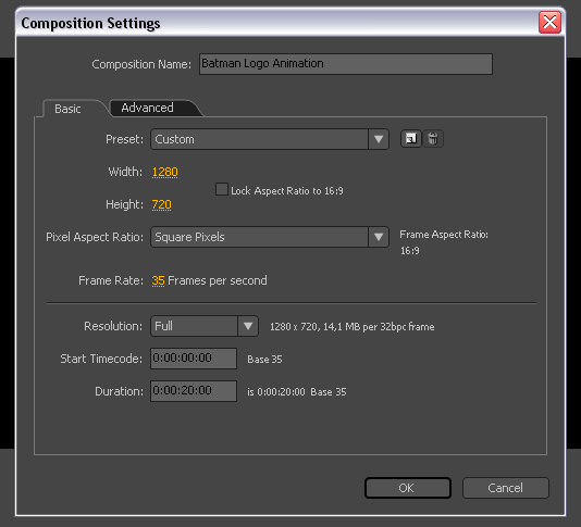 I create a composition by clicking Menu-> Composition->New Composition. Make it 1280*720 square pixels 20 seconds long, name it as ‘Batman Logo Animation’.