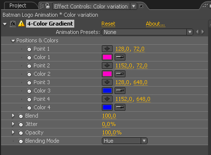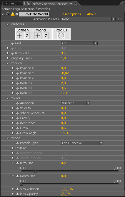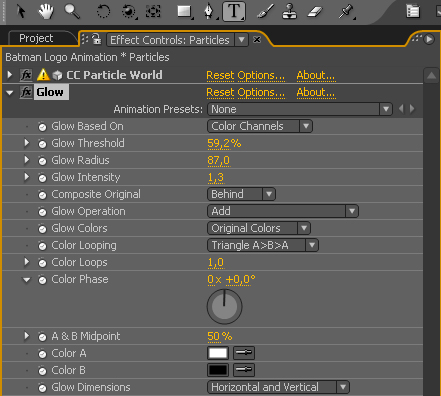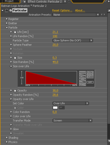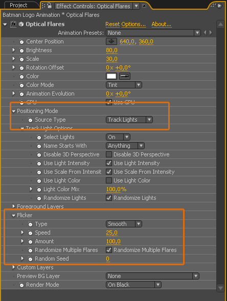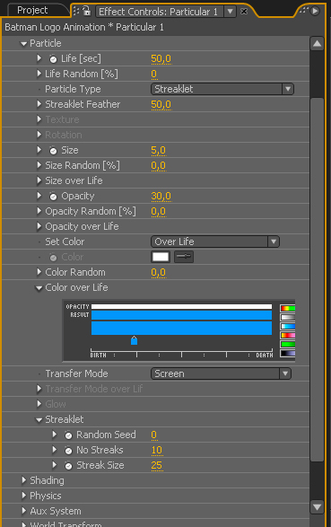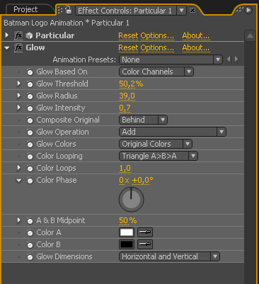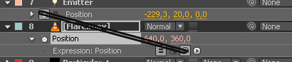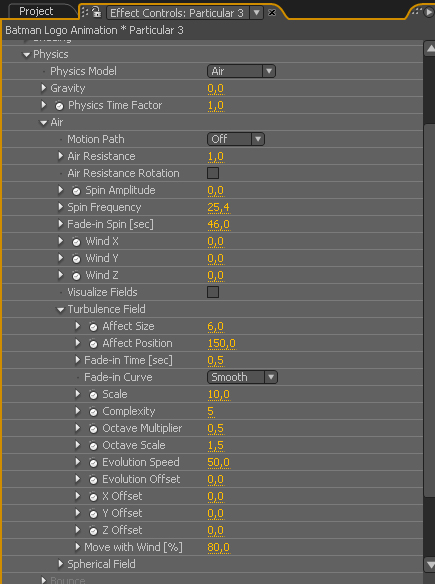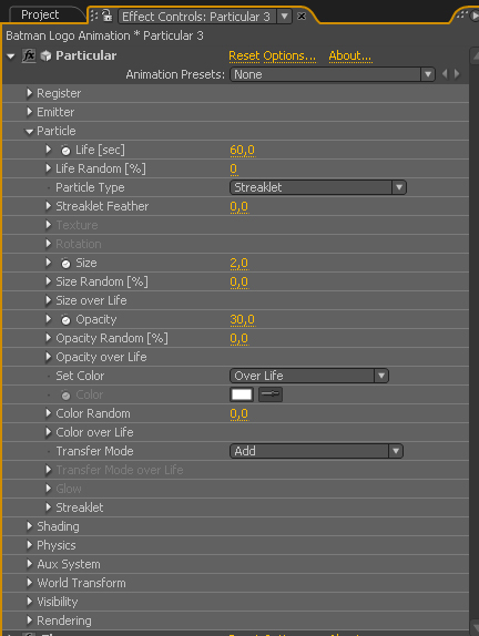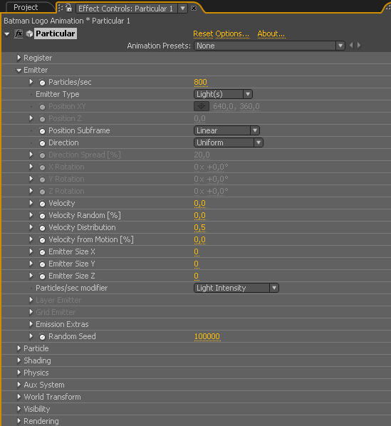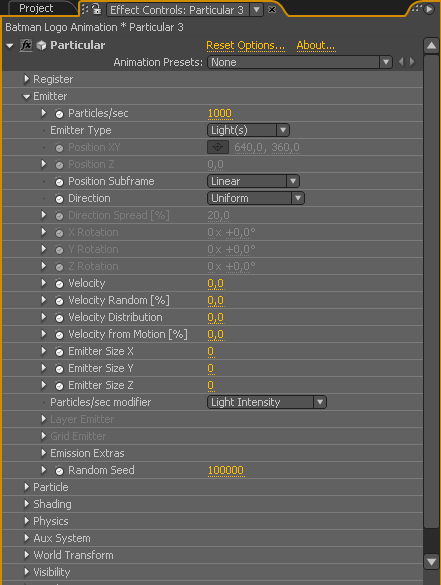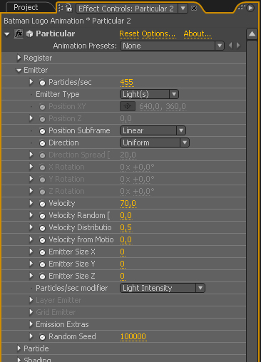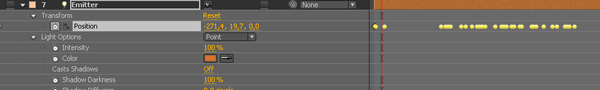 Before I forget. We have to reveal the Emmiter light position values so just select the Emitter layer and hit the "p" key on the keyboard.You have to select the position propertie and press ctrl+v or go to Edit->Paste.Now our particular emitter will follow the batman logo’s outline.If the animation is too quick or the keyframes are too close to each other then you have to select the keyframes, hold down the "alt" key on the keyboard and move them to right.Now select again the particular layer because we have to set more properties.