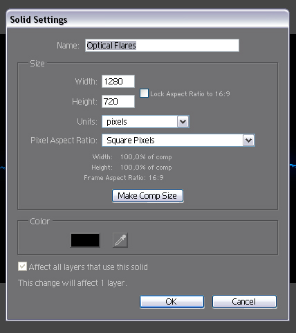 Now it"s time to create the flares. If you don’t have Optical Flares then you can use the pre-rendered flare animations and you can easily colorize the flares, but first let’s create the flares. Create a new solid clicking by Menu->Layer->New->Solid. Change the color to Black. Make it comp size (1280*720) and name it as ‘Optical Flares’.