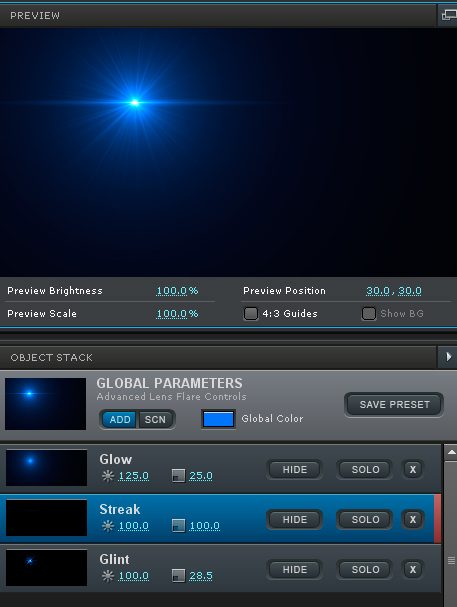I used a Glow, Streak, Glint and set the color to #4174F6. You can create your own flare if you want so the most important thing is the color.
