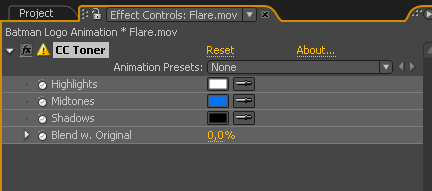 We want a blue flare so we have to colorize this pre-rendered flare. Go to Effect->Color Correction->CC Toner and apply it and set the Midtones to #4174F6. If you want to change more then add the curves+ the levels effect but this is not necessary.