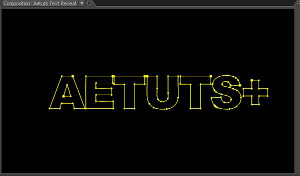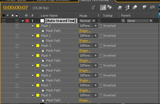 If you want to create the type reveal then you have to type in a text with a wihte color and you have to use Auto Trace as we did it with the batman logo, but if you use texts then you will need more lights because you will have more mask paths.Let’s see an example.As you can see we have a lot of masks if we trace a text for example as I did in the Aetuts logo text reveal.In this case you will have to copy all mask’s mask path and paste them in a Light Emitter.If you don’t do it then your text wont be complete.This happening if you use more complex shapes (Flourishes maybe).